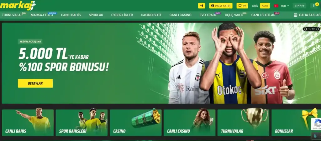 Resmi sayfası üzerinden Markaj bahis sitesine giriş yapmak mümkündür. Oldukça kolay bir şekilde bu bahis sitesine giriş yapabilirsiniz. Daha sonrasında kullanıcı girişi için ana sayfada yer alan sağ üst köşedeki butonları doldurmanız gerekmektedir. Buradan kullanıcı girişini yaptıktan sonra stres sizin için hazır olacaktır. Ayrıca bu giriş adresi zaman zaman güncellenmektedir. Çünkü türkiye’deki bahis kanunları gereği online sitelerde bazen erişim yasakları uygulanmaktadır. Sürekli tekrarlayan bu durumun sebebi. Yurt dışı lisanslı bir site olmasıdır.